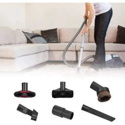 ăPaketă6-teiliges Set. 1x langer Flachsauger, 1x Sofasauger, 1x Zwei-in-Eins-Flachsauger, 1x runde RosshaarbĂŒrste, 1x T-BĂŒrste, 1x 32-mm-35-mm-UmrĂŒstkopf.
