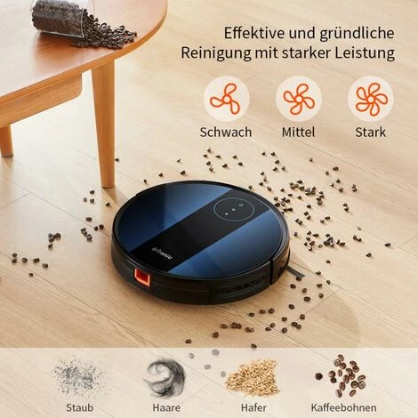 – 3000Pa Starker Sauger, einstellbare Leistung : Dieser Roboterstaubsauger verfügt über drei einstellbare Geschwindigkeitsstufen, sodass Sie eine geeignete Geschwindigkeit für die Reinigung Ihres Hauses wählen können. Haare, Staub oder andere Partikel werden aufgrund seiner starken Leistung leicht eingesaugt.