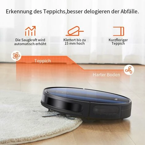 – Erkennung des Teppichs, bessere Verdrängung von Schmutz : Während der Reinigung, wenn er auf dem Teppich angekommen ist, erhöht er automatisch die Leistung, um festsitzenden Schmutz aus dem Teppich zu saugen.